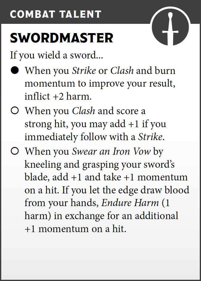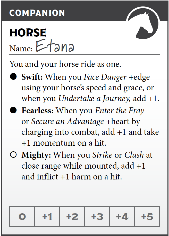 I think a moment about my options here. Kuno, despite her courage, would be unnerved by the sight of this beast leaping towards them. Also, her first concern is the safety of her horse. I could Clash (page 80), but I want to play it a bit safe this early in the fight. If I Clash and score only a weak hit, I’d have to suffer the full harm or some other dramatic result. Face Danger (page 60), on the other hand, gives me only a minor cost on a weak hit. Also, my companion has the Swift ability, which allows me to make that move with a bonus. Per the asset, “When you Face Danger with +edge using your horse’s speed and grace, or when you Undertake a Journey, add +1.”