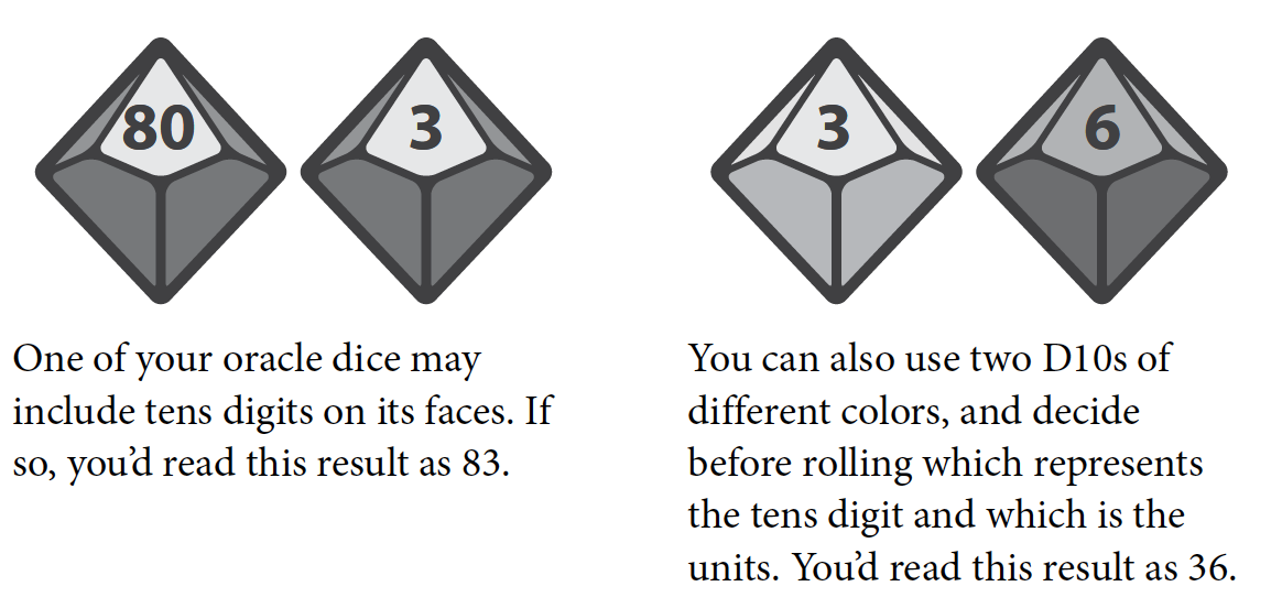 Whenever you are prompted by a move or an oracle table to generate a result between 1 and 100, roll two ten-sided dice.