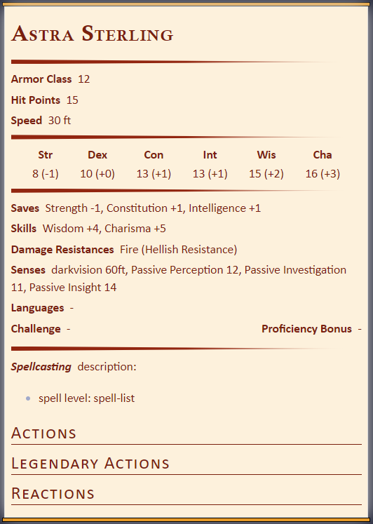 senses: "darkvision 60ft, Passive Perception 12, Passive Investigation 11, Passive Insight 14"